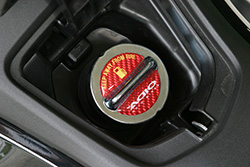 普段は見えないフューエルキャップ。でも給油の際には、必ず見える部分でもあります。フューエルキャップ自体は、金属製の無機質な物。このフューエルキャップに、貼るだけでファッショナブルになるエンブレムの発売です。本物カーボンシートの上からソフトタイプの樹脂を被せた、柔軟性のあるエンブレムシールです。手触りもソフトで傷も付きにくくなっています。黒、青、赤の3種類の設定で、お好みやボディカラーと合わせて選べます。
