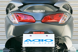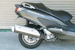2種スクーターと比べると、排気量も車体も一回り大きなスズキバーグマン200。スタイルも堂々した重厚感のあるものです。しかし、車体に合わせてリアフェンダーも幅が広く、少し重い感じがします。純正のリアフェンダーをカットし、ナンバープレートを少し上方に移動。リフレクターを半分隠してシャープな薄型リフレクターに見せています。そしてナンバーの角度も付けることにより、スポーティーでレーシーなリアビューを実現。