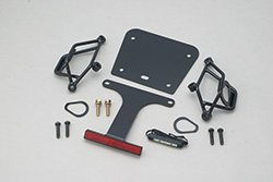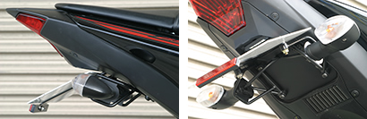 ナンバープレートの位置を変更しても、純正のナンバー灯と、純正のリフレクターでは、スタイルが台無しです。キットには、LEDナンバー灯とスリムリフレクターを付属させました。このナンバー灯とリフレクターを使用することにより、トラス構造のステーと相まって、より一層のシンプル&レーシースタイルを完全な形としています。